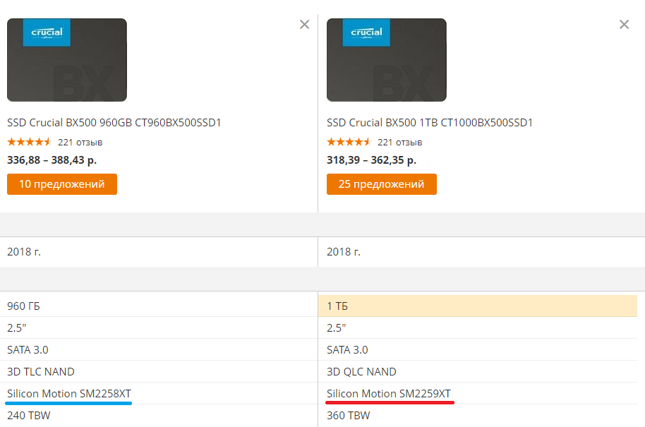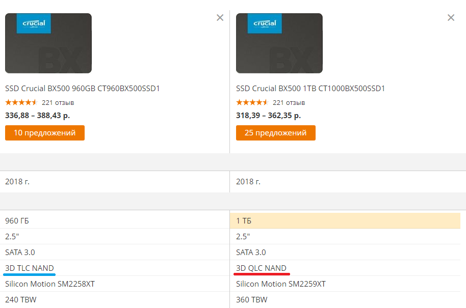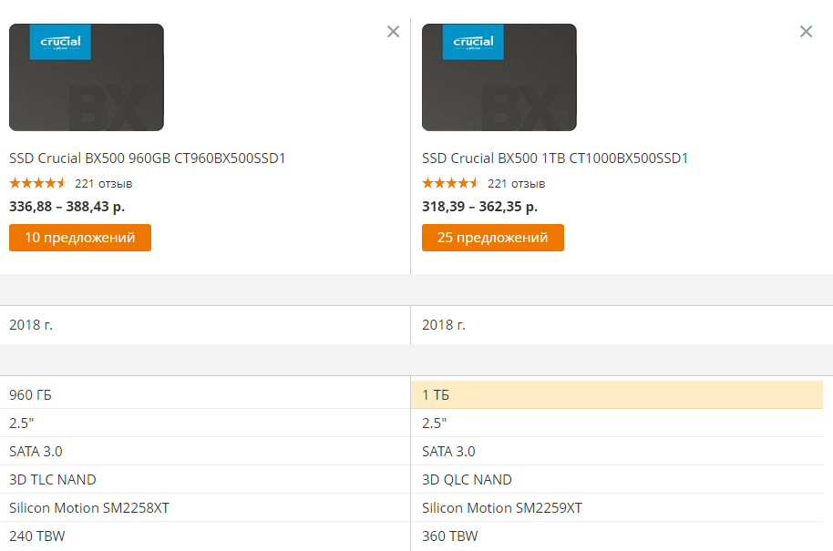 Факт номер два состоит в том, что наряду с данной моделью в продаже почти за ту же цену (чуть дороже) можно найти SSD Crucial BX500, но на 960 ГБ. На фоне 1 ТБ разница в 40 ГБ кажется незначительной, но и кроме объема между двумя SSD имеются различия (существенные).