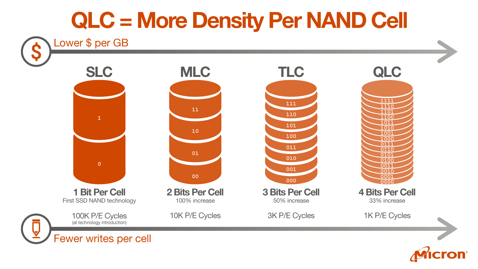 И вот очередной виток эволюции привел к следующему типу памяти QLC (Quad-Level Cell; четыре бита данных на одну ячейку). А вместе с ним – к еще более ярко выраженному противопоставлению озвученных плюсов и минусов уплотнения.