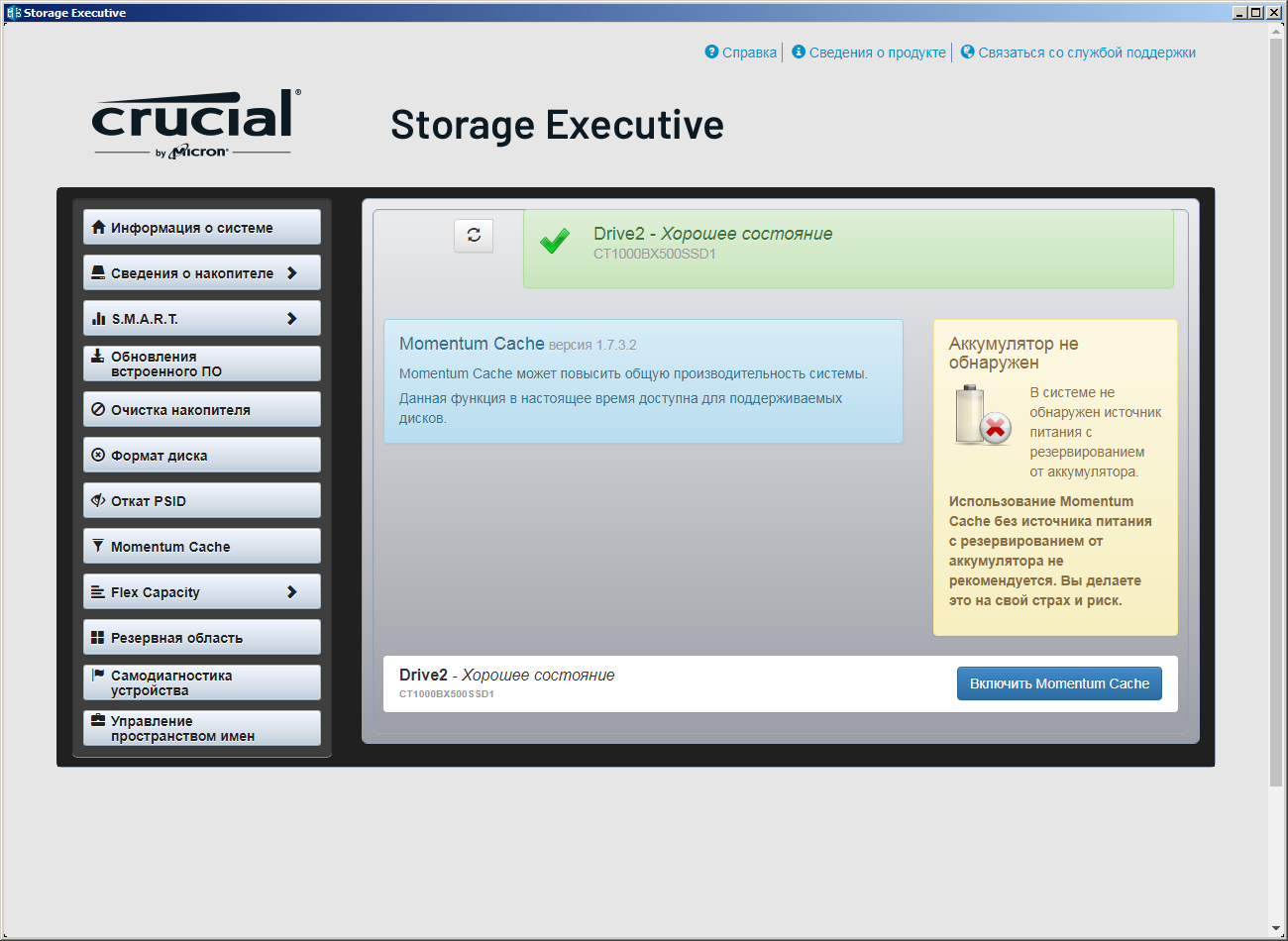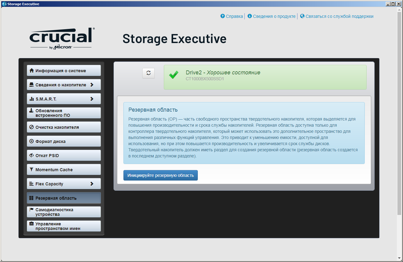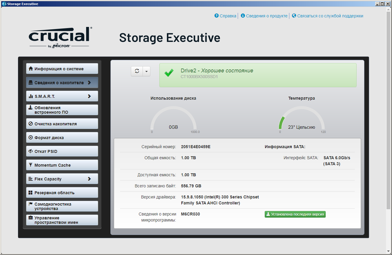 С подключением SSD, понятно, никаких нюансов не возникает. Обязательно рекомендуем скачать с официального сайта фирменное ПО Crucial Storage Executive – отличная утилита для мониторинга состояния и раскрытия всего функционала накопителя. Кстати, одной опцией мы обязательно воспользуемся ниже.
