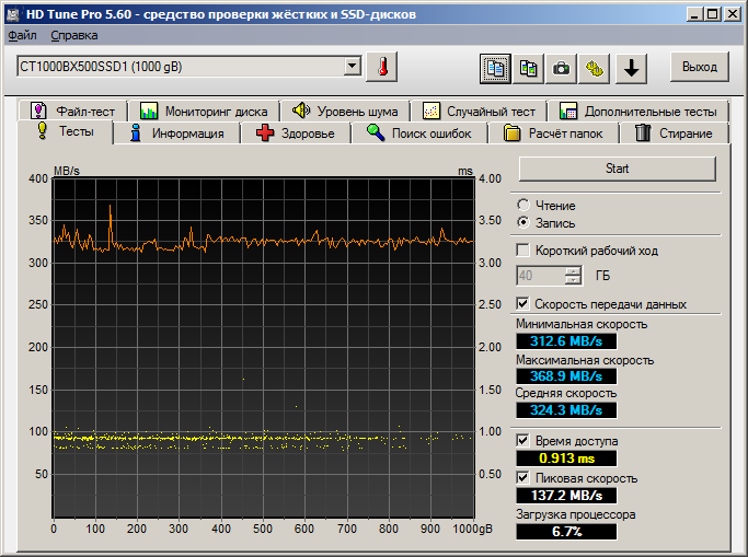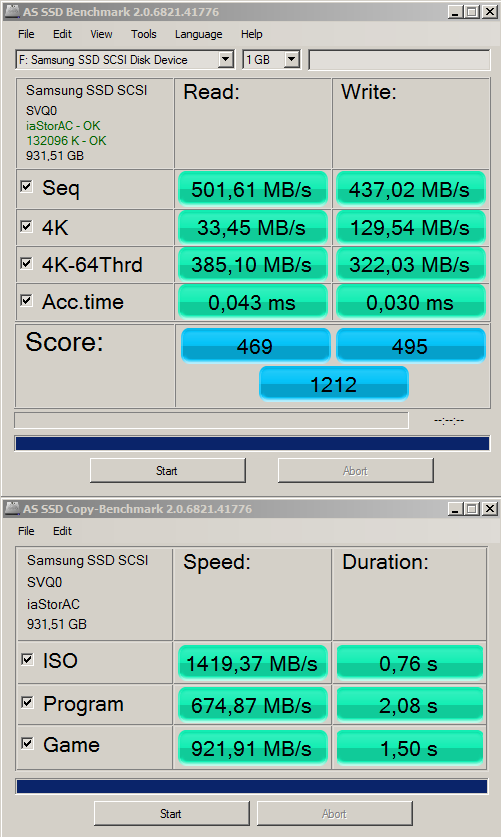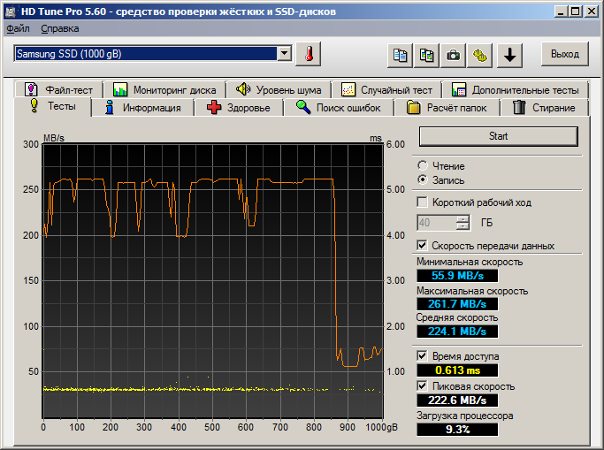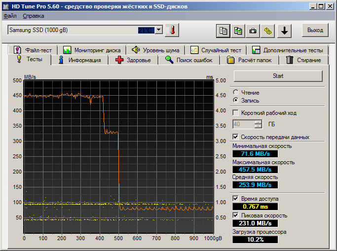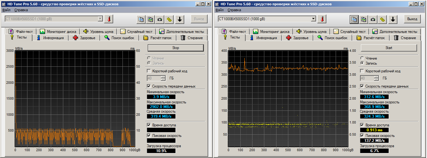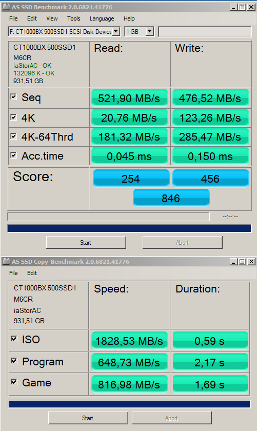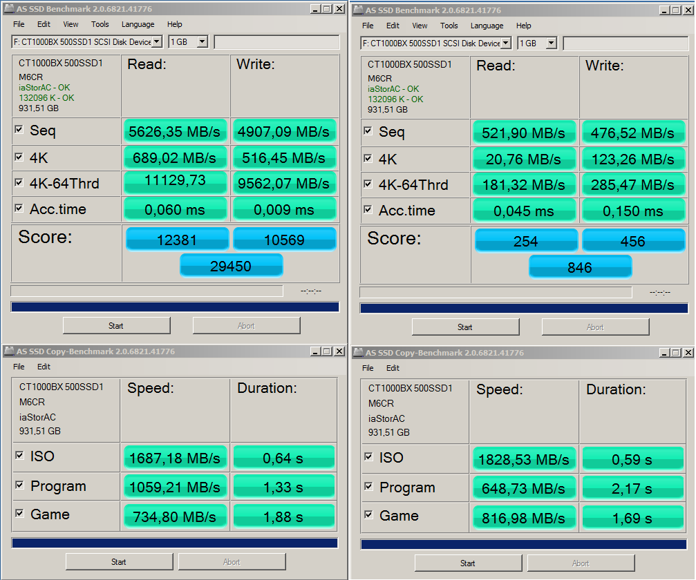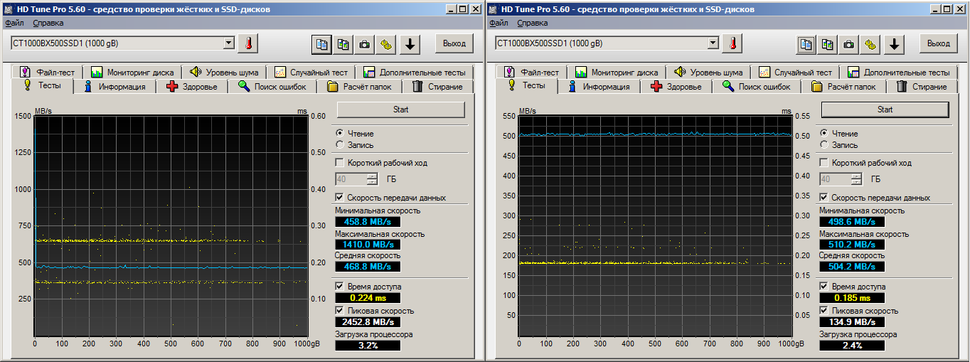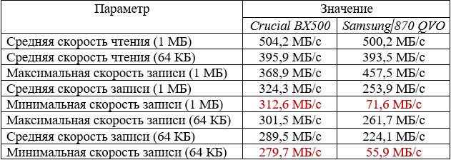 Подведем предварительный итог. В бенчмарках, охватывающих только небольшие объемы памяти, лидирует накопитель от компании Samsung. При замере скоростей чтения всего объема памяти ситуация выравнивается (до единиц мегабайт), а когда дело доходит до записи, то преимущество стоит отдать SSD Crucial BX500. Он всегда «пишет» на постоянной скорости, в то время как оппонент после (50-80) % заполнения существенно снижает скорость.