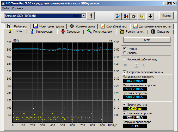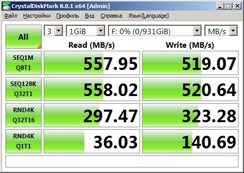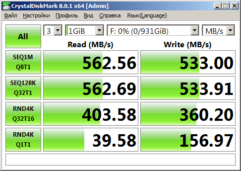 Полученные значения скоростей последовательного чтения и записи соответствую заявленным (у Samsung 870 QVO заявленные скорости последовательного чтения/записи составляют 560/530 МБ/с соответственно).