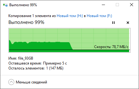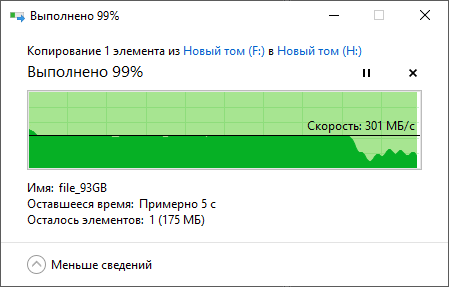 Подтверждает эти выводы и простой обывательский эксперимент –копирование на каждый накопитель одного большого файла объемом около 93 ГБ.