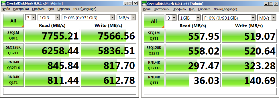 Что ж, скорости чтения/записи подскакивают более чем в десять раз – можно прилично утереть нос конкурентам (слева – «стало», справа – «было»):