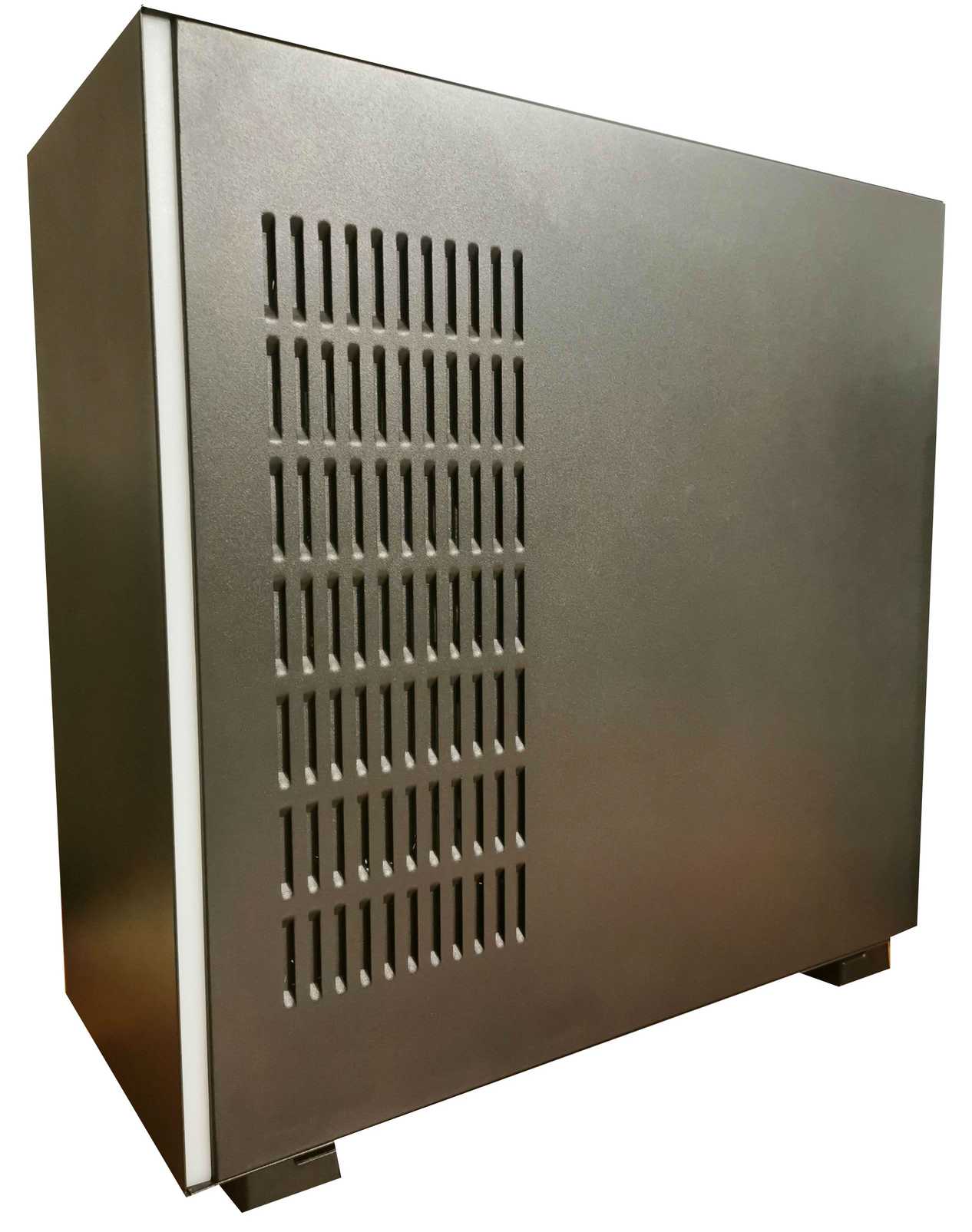 Взгляд сразу замечает нюансы, не характерные для обывательских системных блоков: строгая, сплошная лицевая панель без «никто» (кнопок, разъемов, перфораций, 5,25'' заглушек, объемных элементов дизайна), магнитная полоса-наклейка почти на всю длину корпуса, довольно высокие ножки, и да – полностью прозрачная боковая панель, сквозь которую видны все внутренности компьютера