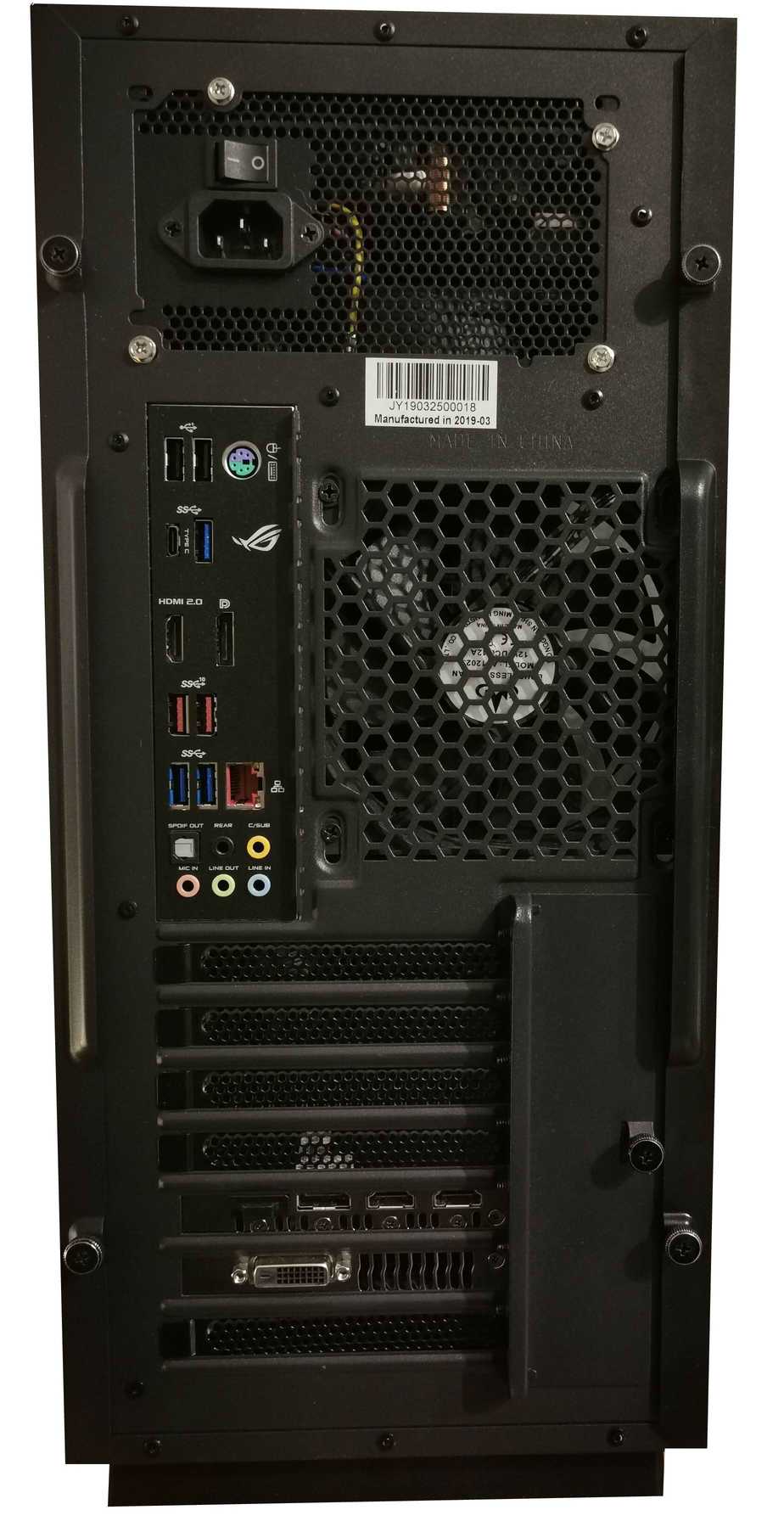 Сзади видим любопытное нововведение: блок питания установлен сверху. Последнее время как-то считалось продвинутым его нижнее расположение, но вот опять, видимо, случается очередной виток компьютерной эволюции. Хотя, в данном случае, такое размещение БП весьма удачно, ведь оно очень положительно сказывается на компоновке остальных комплектующих. Однако об этом ниже.