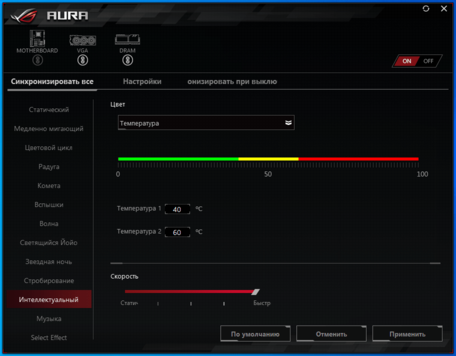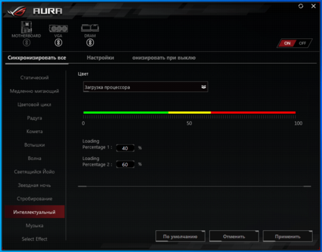Заканчивая описание подсветки, хочется отметить особо два режима. Первый, Интеллектуальный – из-за наибольшей полезности. Это очень удобно, когда по цвету можно судить о температуре или загруженности системы.