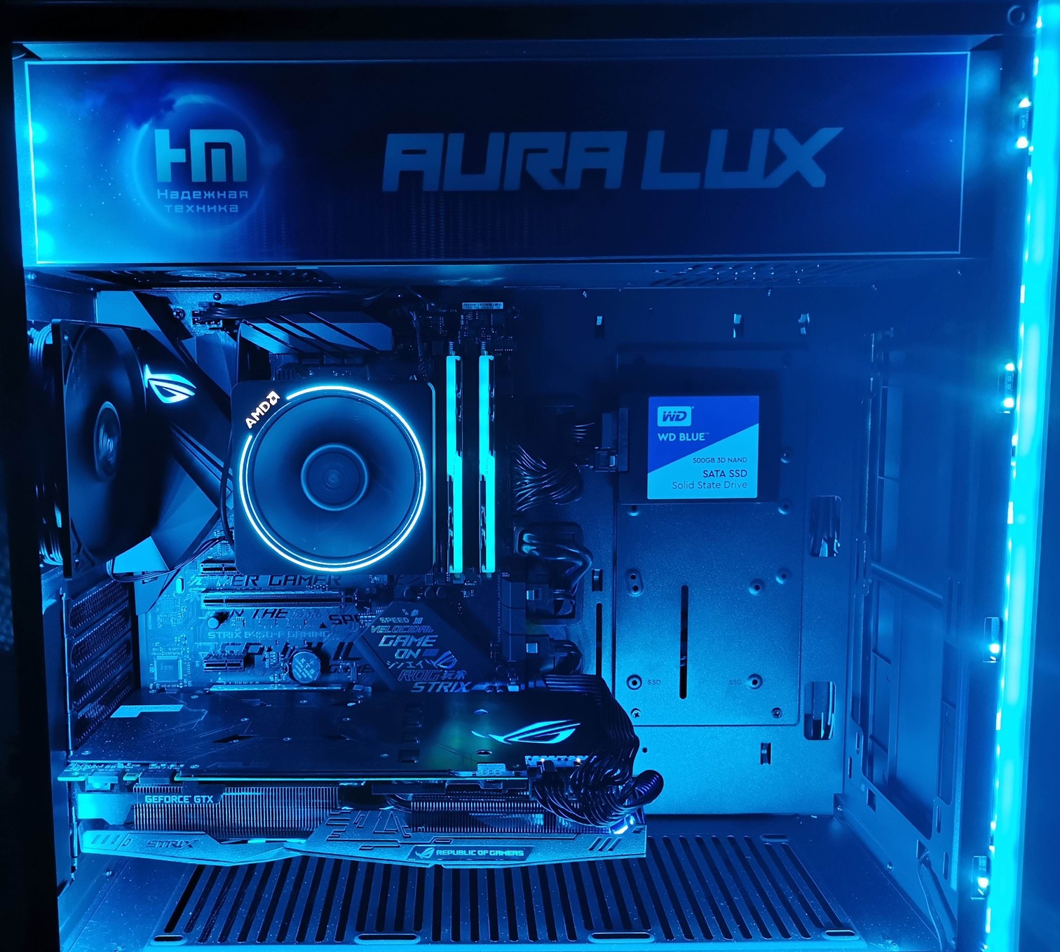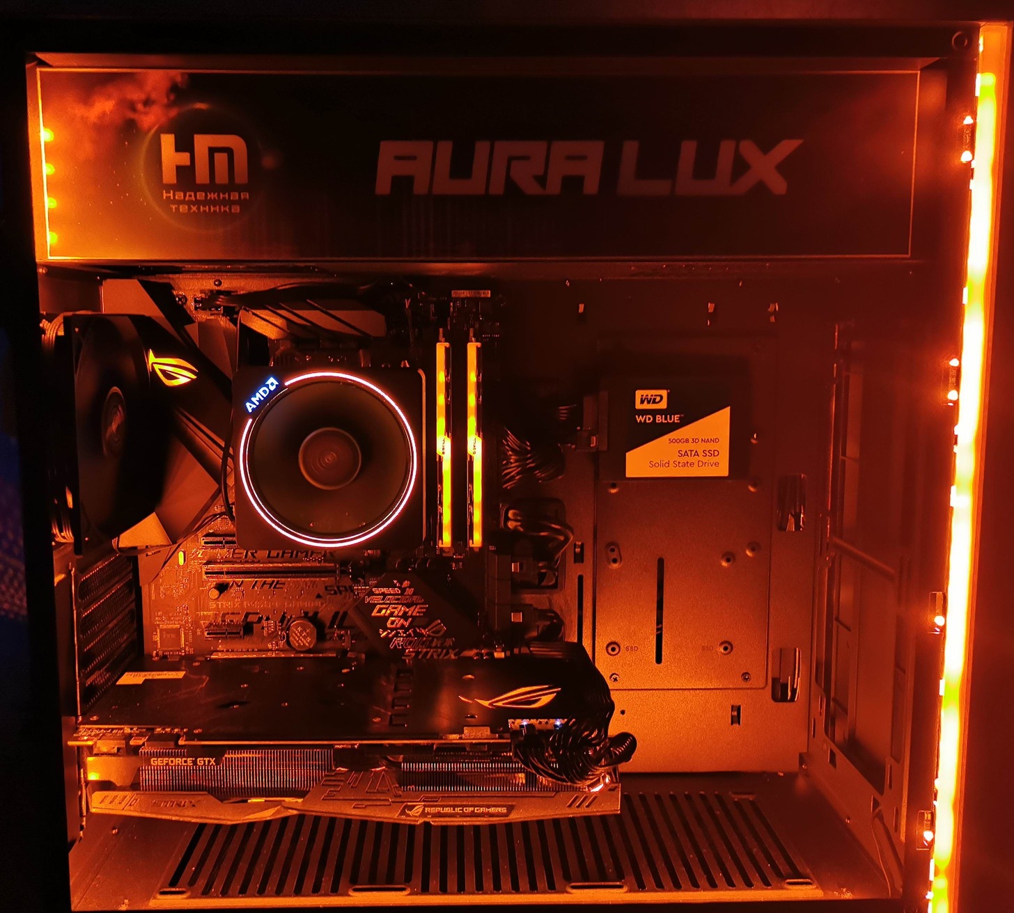 Как таковой, подсветкой оснащены почти все комплектующие. В материнской плате, модулях оперативной памяти, видеокарте и системе охлаждения процессора она интегрированная. Подсветка же корпуса реализована путем прокладки по трем кромкам левой и передней кромке правой стенок корпуса двух отдельных RGB LED лент.