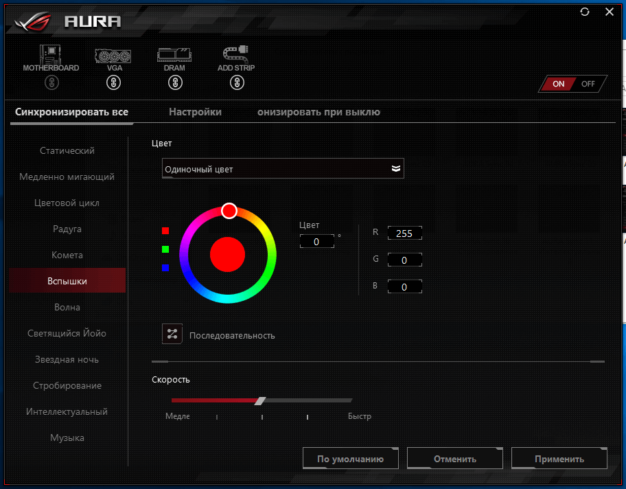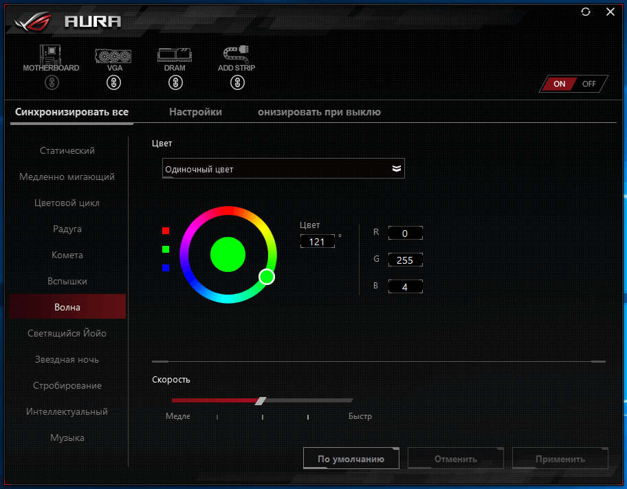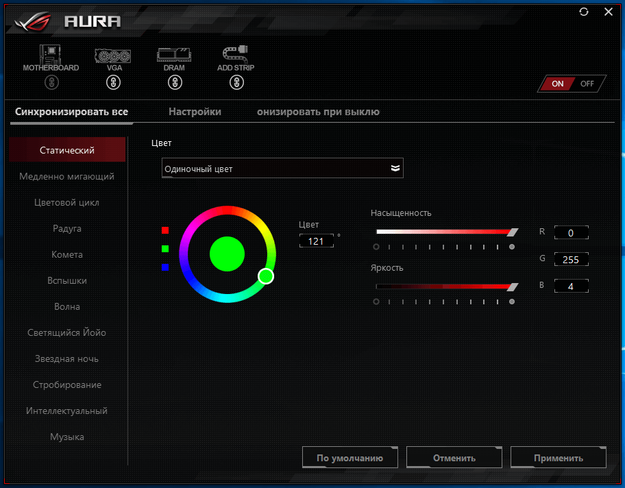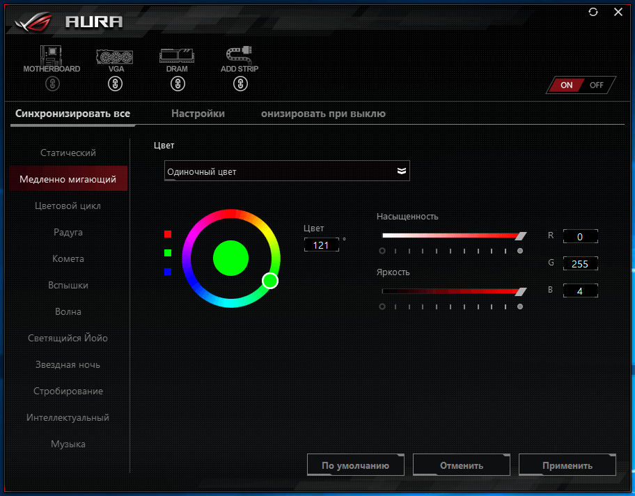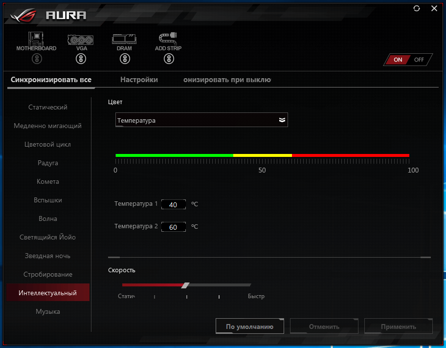 Интеллектуальный – режим, обеспечивающий изменение цвета зон подсветки в зависимости от температуры процессора/видеокарты.
