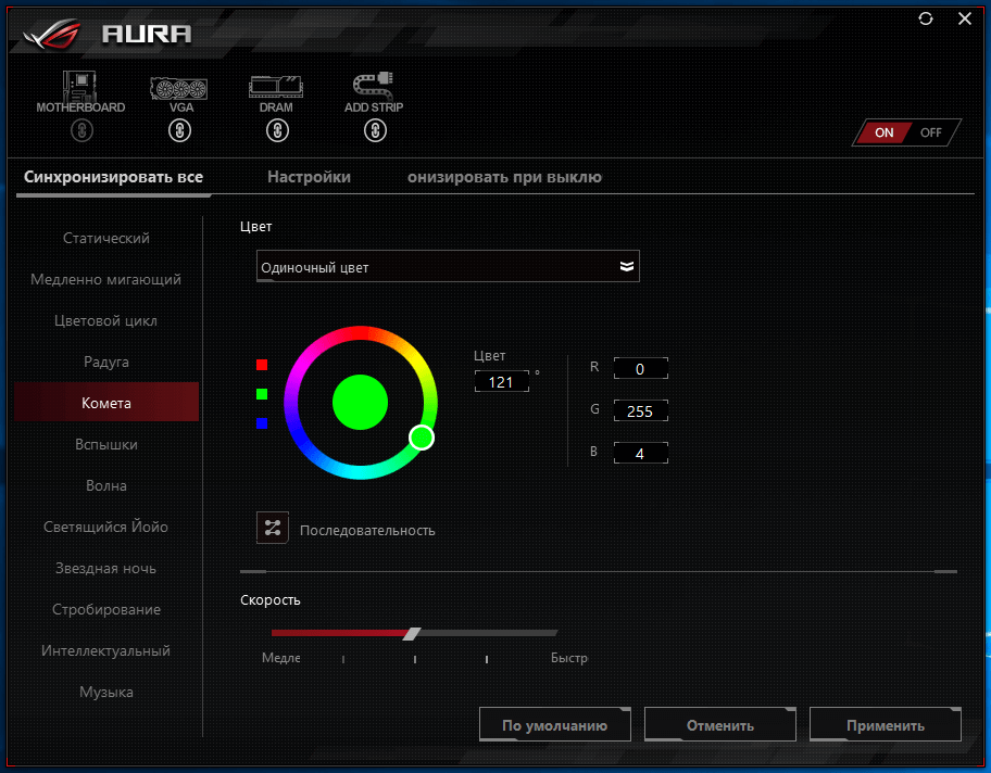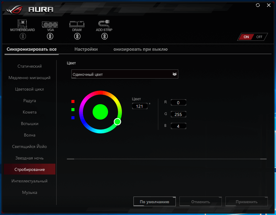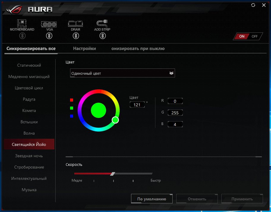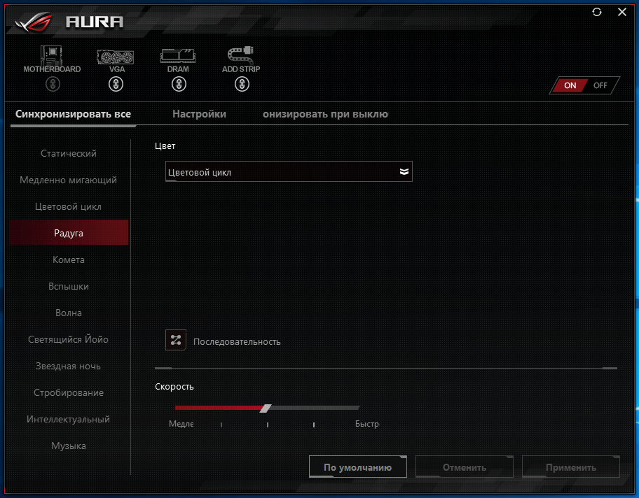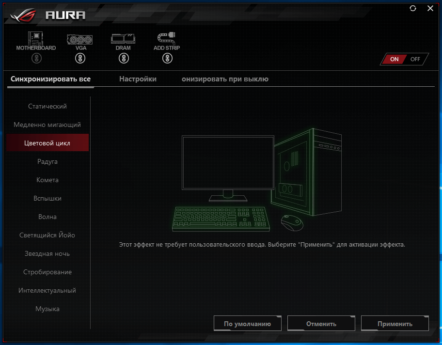 Для облегчения управления эффектами и подсветкой компания ASUS предоставляет пользователю утилиту Aura Sync. С ее помощью можно реализовать несколько режимов работы подсветки вашей системы. Интерфейс программы управления интуитивно понятен. Пользователю доступны 12 режимов работы. Можно проводить тонкую настройку для каждого режима и менять скорость работы световых эффектов. Познакомимся ближе с возможностями, которые предоставляет эта программа.
