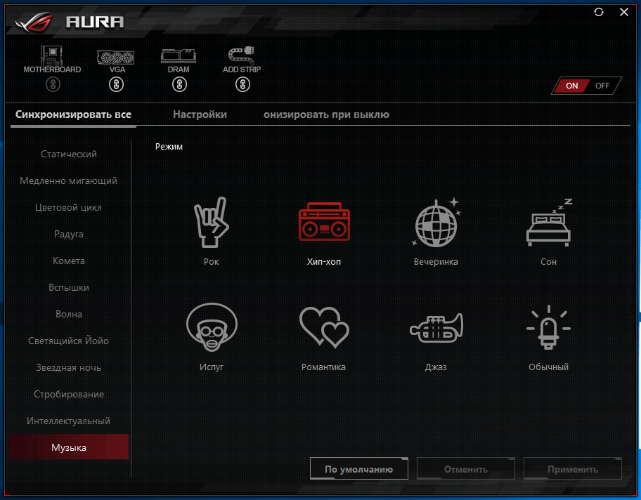 Музыка – данный режим позволяет реализовать пульсацию зон подсветки в ритм выбранной вами мелодии.