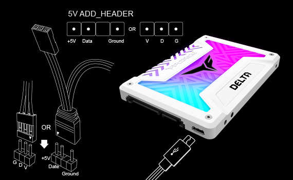 Кроме стандартных SATA подключений для работы RGB подсветки модель DELTA RGB SSD должна быть соединена с материнской платой специальным комплектным кабелем по предлагаемой схеме.