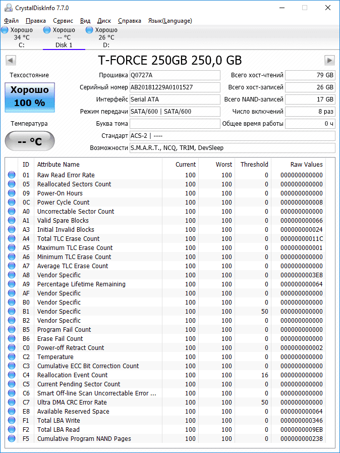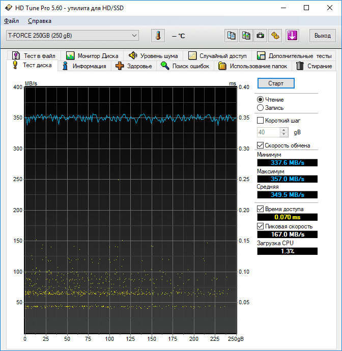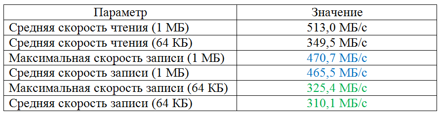 Полученные значения скоростей последовательного чтения и записи соответствую заявленным.
