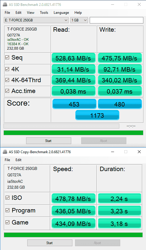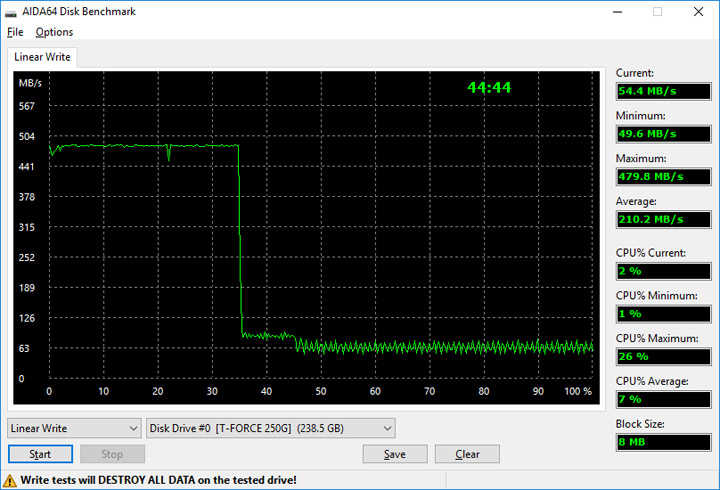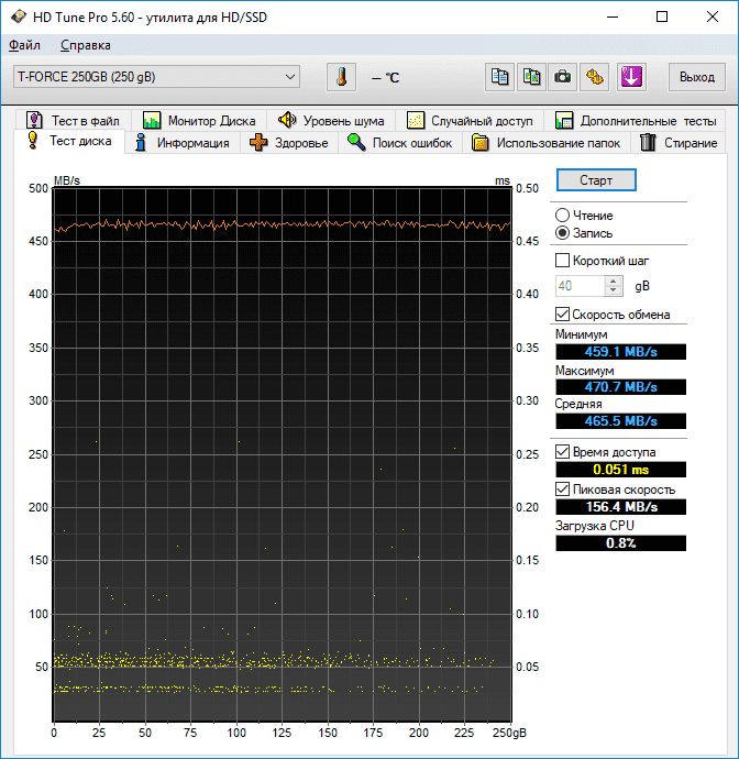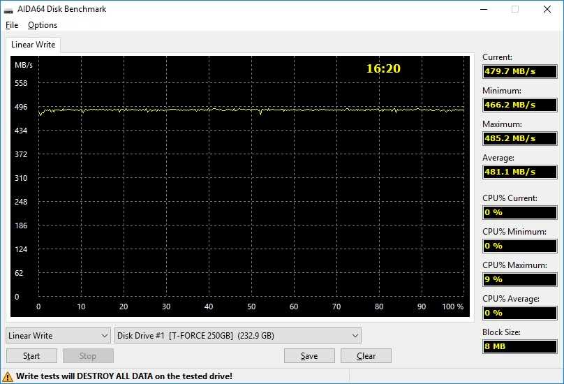 Результаты оказались очень интересны. Максимальные и средние скорости записи вышли почти равными, что говорит об отсутствии здесь распространенной в последнее время уловки, когда заявленные скорости достижимы лишь в небольшом объеме памяти ((5-15) %), называемой SLC кэшем, а далее значения существенно падают. Тестируемый же SSD читает и пишет данные всегда с одинаковыми скоростями, что очень хорошо!
