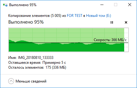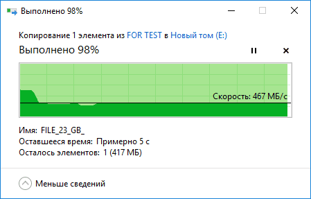 Напоследок, как всегда, простой обывательский эксперимент – оцениваем скорости копирования на накопитель одного файла объемом 23 ГБ, а затем 10000 небольших файлов общим объемом около 17 ГБ.