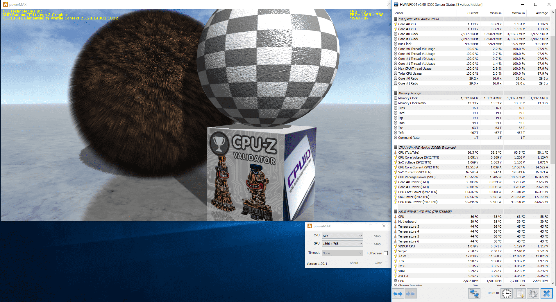 Пиковая температура на 20-й минуте теста достигла всего 54 градуса, вентилятор раскрутился до величин порядка 2400 об/мин, субъективно уровень шума не превысил комфортной границы даже в полуметре от тестового стенда. Показания уровня TDP в таком режиме уложились в заявленные в спецификации 35 ватт, в пике достигнув величины 33 ватта по данным программного мониторинга и в среднем колебались около отметки 22-27 ватт. Никакого троттлинга не отмечено, процессор удерживал заданную в спецификациях штатную частоту вычислительных ядер 3.2 ГГц на протяжении всего теста. Далее переходим к одновременной нагрузке вычислительных ядер и встроенного графического ядра при помощи утилиты PowerMaxx 1.00: