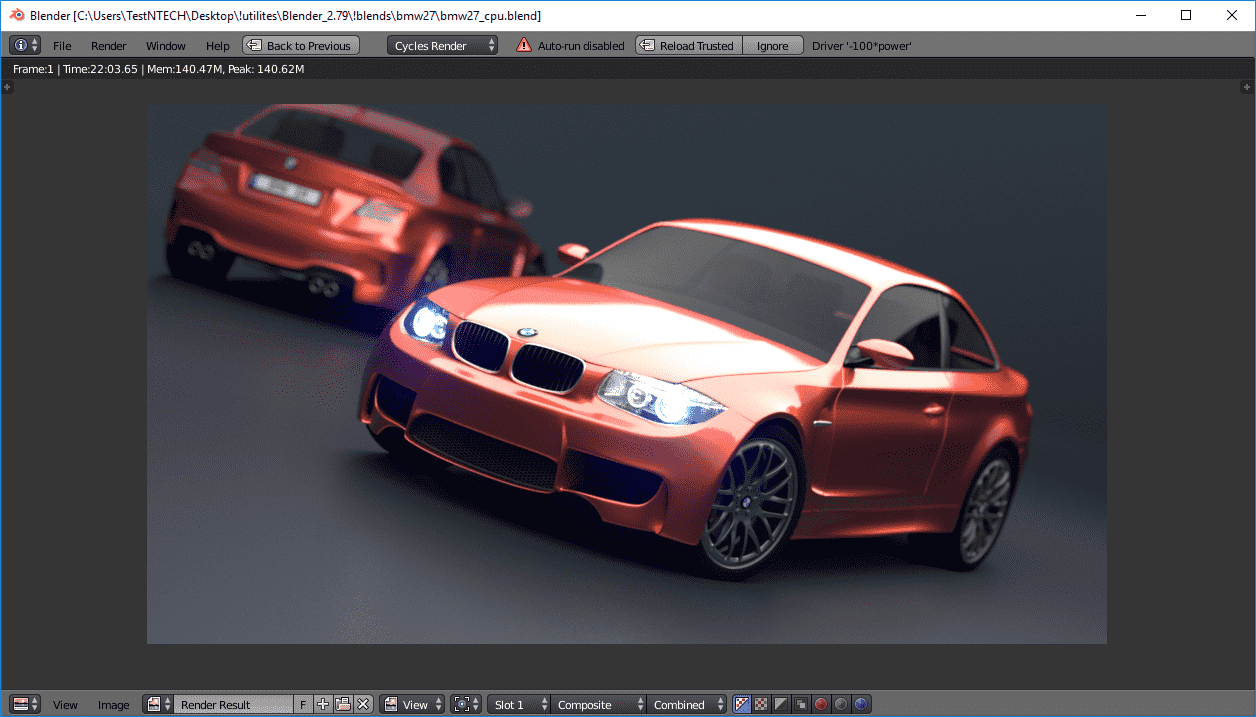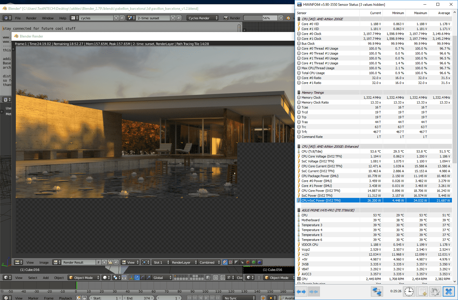 В качестве стресс-нагрузки, позволяющей выявить типично достижимый в реальной работе уровень максимальной температуры был выбран рендеринг общедоступной тестовой сцены Barcelona Pavillion для бесплатного пакета 3D-моделирования Blender 2.79b. Были получены следующие результаты: