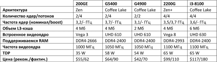 В таблице ниже представлено сравнение технических характеристик тестируемого процессора с прямым конкурентом в лице Pentium G5400, а также соседствующими по цене и позиционированию представителями младших линеек обоих производителей центральных процессоров: