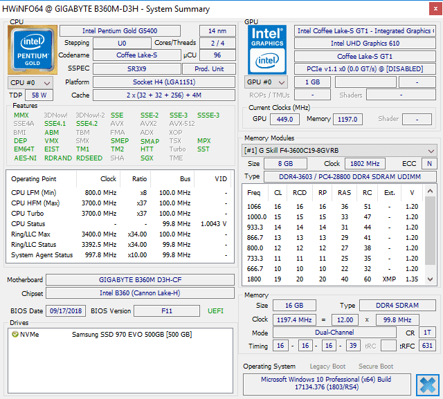 Оперативная память работала в режиме DDR4-2400 со стандартной для массовых планок такой частоты схемой задержек 16-16-16-39_1Т. Скриншоты результатов G4900 и G5400 не приводим, дабы не перегружать статью, ограничимся лишь фотографиями тестового стенда и скриншотами системных отчетов утилиты HWiNFO64: