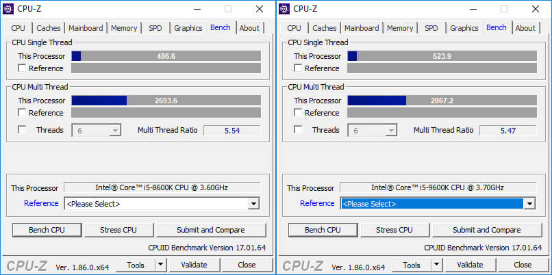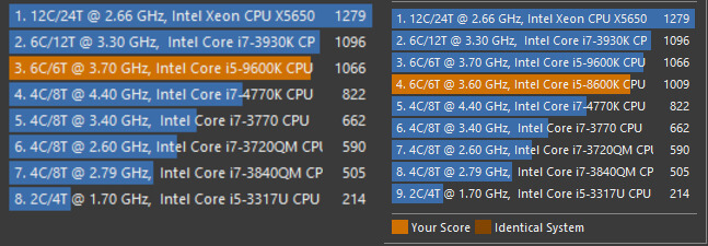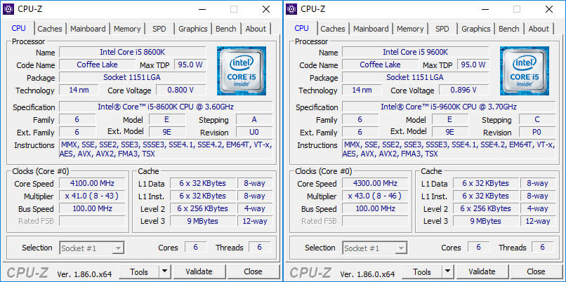 Новый процессор i5-9600k показал на 7.6% большую производительность при расчетах одним ядром (CPU Single Thread), и на 6% большую производительность при расчетах на всех шести ядрах (CPU Multi Thread). Разница в производительности хорошо заметна из-за более высоких частот процессора.