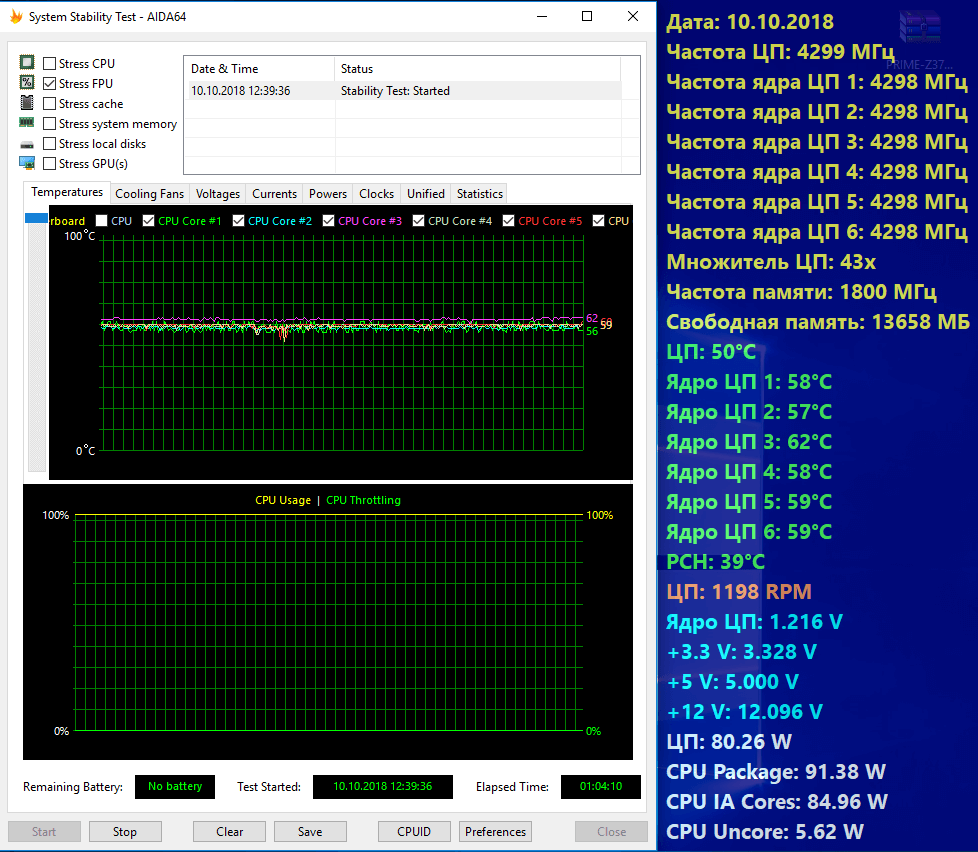 В номинальном режиме работы, в тесте стабильности AIDA64 FPU test, процессор i5-9600k демонстрирует умеренные температуры с максимальным значением температуры самого горячего ядра в 62 градуса.