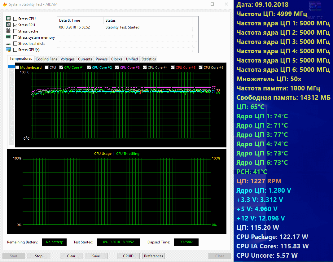 При частоте 5000 мегагерц на все шесть ядер, в тесте стабильности AIDA64 FPU Test, температура самого горячего ядра процессора i5-9600k поднялась на 15 градусов (с 62 до 77) градусов по сравнению с температурами в номинальном режиме работы.