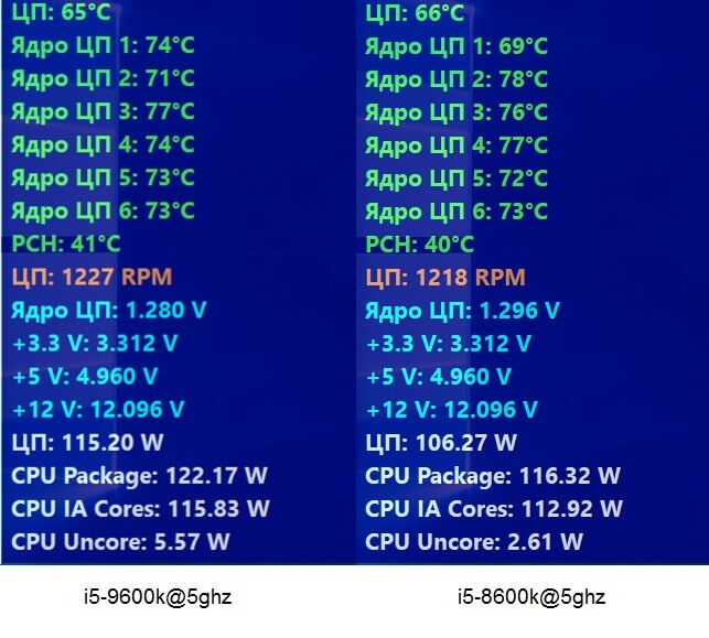 Разогнанный до 5000 мегагерц процессор i5-8600k показал далекие от критических значений температуры с запасом 22 градуса. По показаниям мониторинга стресс-теста AIDA64 потребляемая мощность обоих процессоров была в районе 120 ватт. У i5-9600k показания мониторинга фиксировали потребление в 122 ватта, а у i5-8600k показания мониторинга фиксировали потребление в 116 ватт.