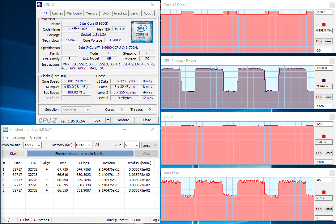 Исследуемый процессор был разогнан i5-9600k до 5000 мегагерц. Напряжение питания ядра процессора было выставлено на 1,29 вольта, с корректирующим параметром Offset +0,02. Параметр Load Line Calibration был выставлен на уровень 5. Чтобы плата дополнительно не повышала напряжение, значения параметров IA AC Load Line и IA DC Load Line были выставлены на значение 0,01. Конечное значение напряжения на ядрах не поднималось выше 1,28 вольта. Такой режим работы был абсолютно стабильным для реальных приложений, но при тесте LinX пришлось уменьшить частоту до 4600 мегагерц.