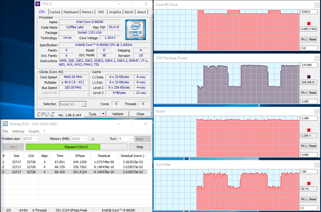 Во время проведения тестирования температуры самого горячего ядра у процессора i5-9600k и у процессора i5-8600k перешагнули значение температуры 90 градусов, показав схожий результат. Показания мощностей, потребляемых процессорами, по программному мониторингу перешагнули отметку 160 ватт.