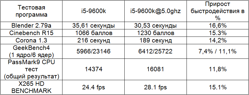 Прирост быстродействия процессора i5-9600k в проведенных тестах от разгона