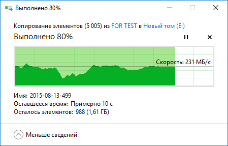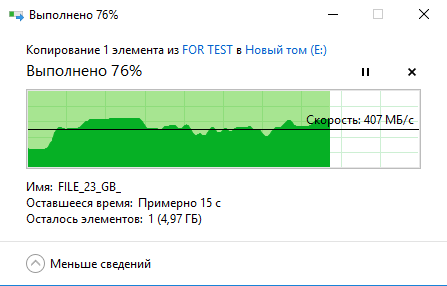 В конце, как всегда, простой обывательский эксперимент – оцениваем скорости копирования на накопитель одного файла объемом 23 ГБ, а затем 10000 небольших файлов общим объемом около 17 ГБ.