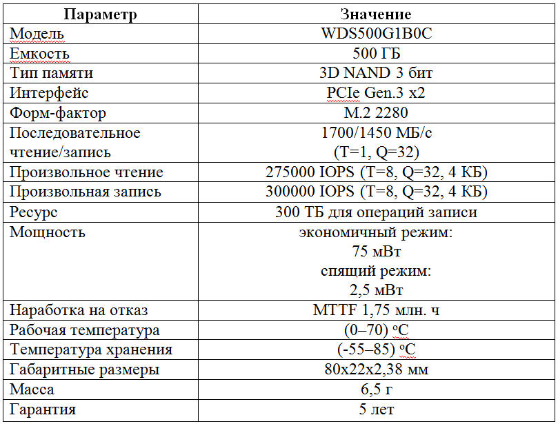 Во-первых, теперь это NVMe накопитель, так как после двух SATA-предшественников в Western Digital решили все же перейти на более перспективный PCIe интерфейс. Во-вторых, заявляются такой же ресурс и аналогичный срок гарантии, как и на накопители серии WD Black такого же объема, что не может не радовать. А в-третьих, отмечаем почти трехкратный прирост скорости чтения/записи по сравнению с предшественником WDS500G2B0B – и это даже несмотря на использование только двух линий PCIe (у моделей WD Black, напомним, интерфейс PCIe х4).