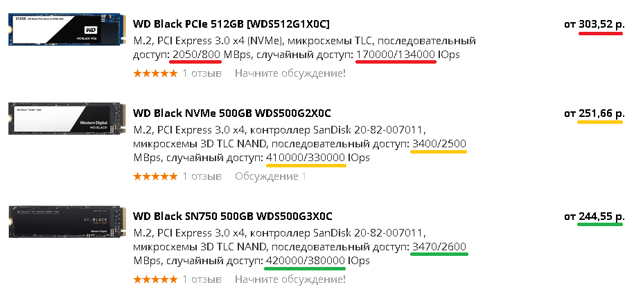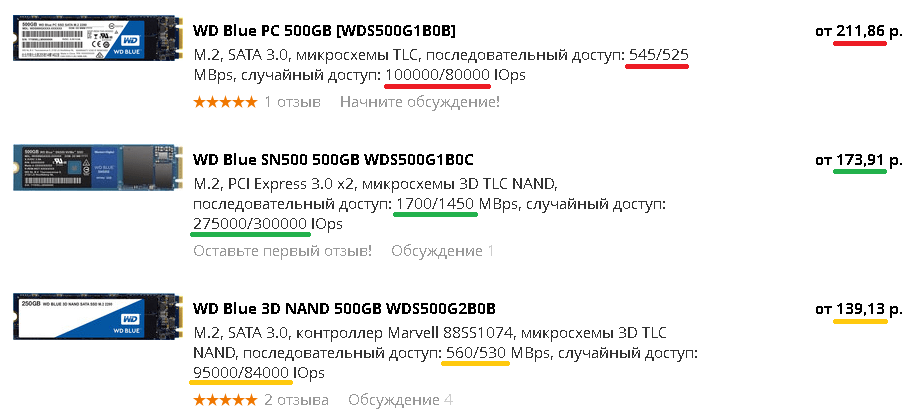 Другой пример. Линейка M.2 SSD WD Blue. Отличия в одном-двух знаках: WDS500G1B0B, WDS500G2B0B, WDS500G1B0C. Опять же, предлагаются одновременно все, и, аналогично, самая «древняя» модель – самая дорогая.