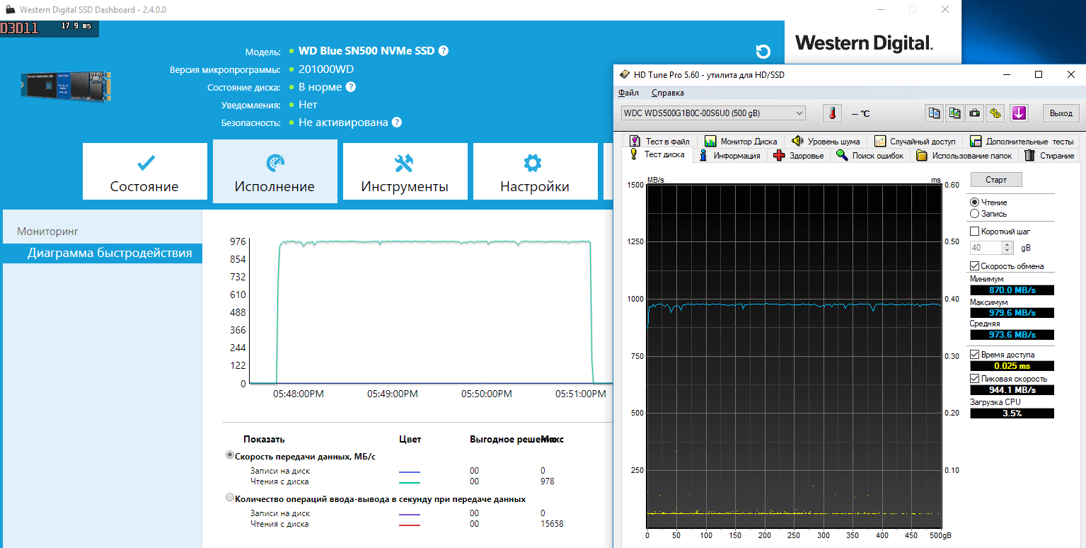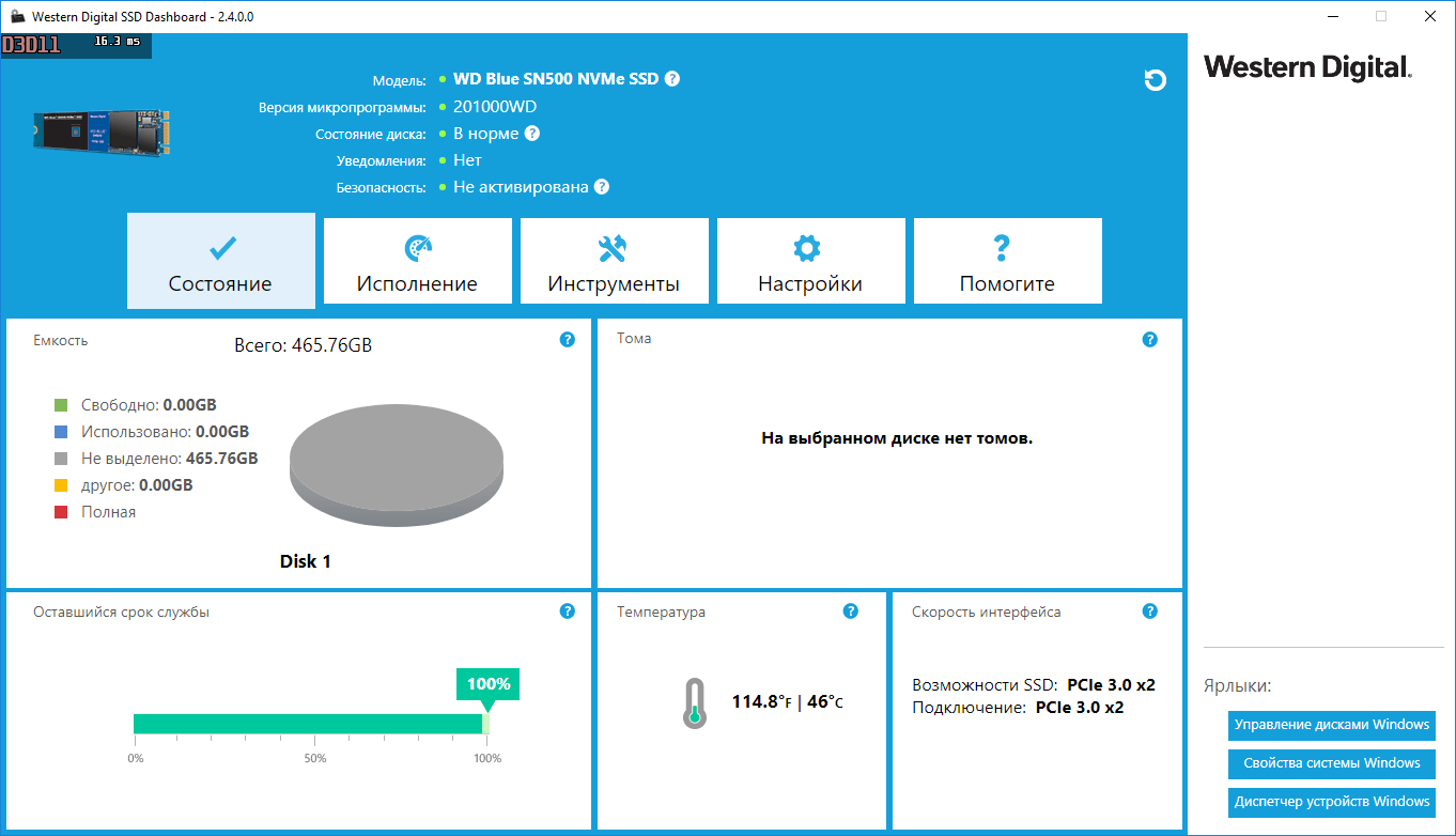 Сначала, больше для «галочки», запускалась фирменная утилита Western Digital SSD Dashboard. Так как здесь все давно знакомо и понятно, подробно останавливаться на функционале ПО не будем.