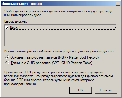 Поставляется жесткий диск с неинициализированным и, понятное дело, не форматированным пространством. Напомним, что для накопителей объемом более 2 ТБ в ОС Windows 7 и выше при инициализации следует выбирать стиль разделов не MBR, а GPT, иначе система сможет оперировать только с объемом 2,2 ТБ, вместо, например, 3 ТБ, 4 ТБ и так далее.