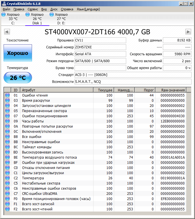 Для начала была запущена утилита CrystalDiskInfo, «поведавшая», прежде всего, о скорости вращения шпинделя, названии прошивки, основных SMART параметрах, а также о количестве включения и общем времени работе жесткого диска.