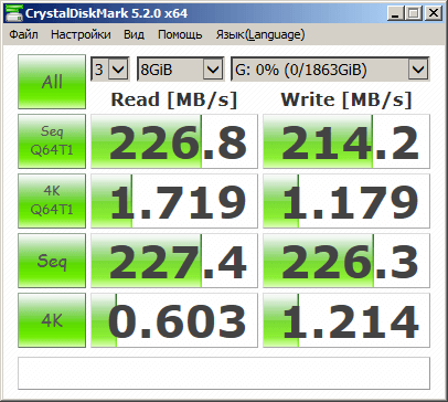 Для оценки скорости работы накопителя в первом приближении использовалась утилита CrystalDiskMark. Запускались все имеющиеся тесты: