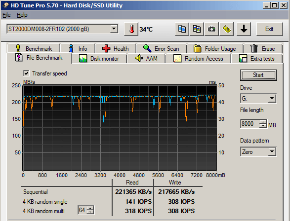 Для проверки полученных результатов запускаем утилиту HD Tune Pro и, используя описание тестов из CrystalDiskMark, выбираем схожий вариант теста (оперирование с файлом 8 ГБ, количество потоков для одного из тестов 64).
