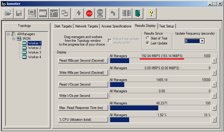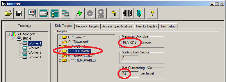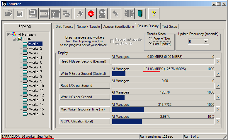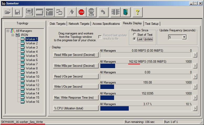 Запускаем третью, гораздо более гибкую в настройках, но на порядок более сложную утилиту – Iometer. Задаем аналогичные параметры тестирования, запускаем 8 прогонов (4 теста на чтение, 4 теста на запись). Тестированию для экономии времени подвергался только Seagate SkyHawk.