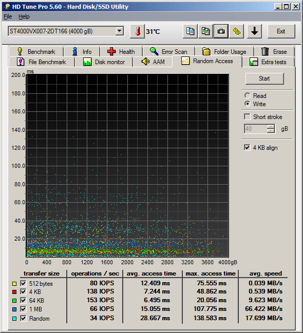 По тесту последовательной записи/чтения наблюдаем схожие значения скоростей, результаты рандомных записей/чтении файлов сегменати по 4 КБ в режиме однопоточности и мультипоточности приведены в IOPS (Input/Output Operations Per Second – количество операций ввода/вывода). Запомним эти четыре значения применительно к Seagate SkyHawk.