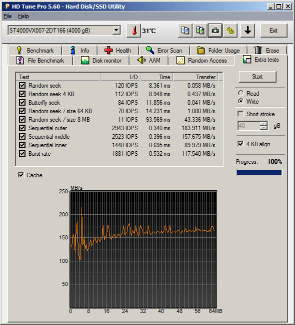 Раз уж HD Tune Pro предлагает кроме показанного выше и другие варианты тестирования, приведем «россыпью» и их результаты.