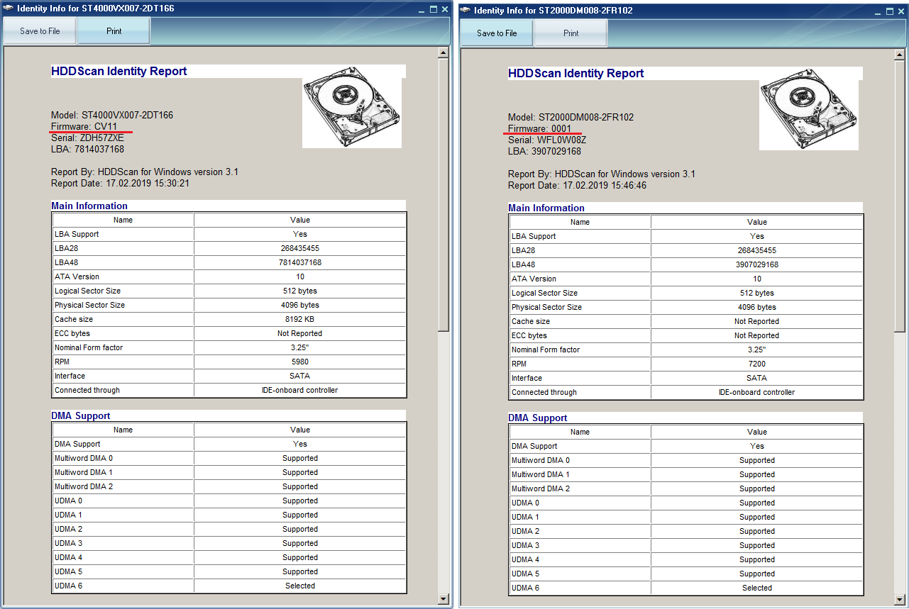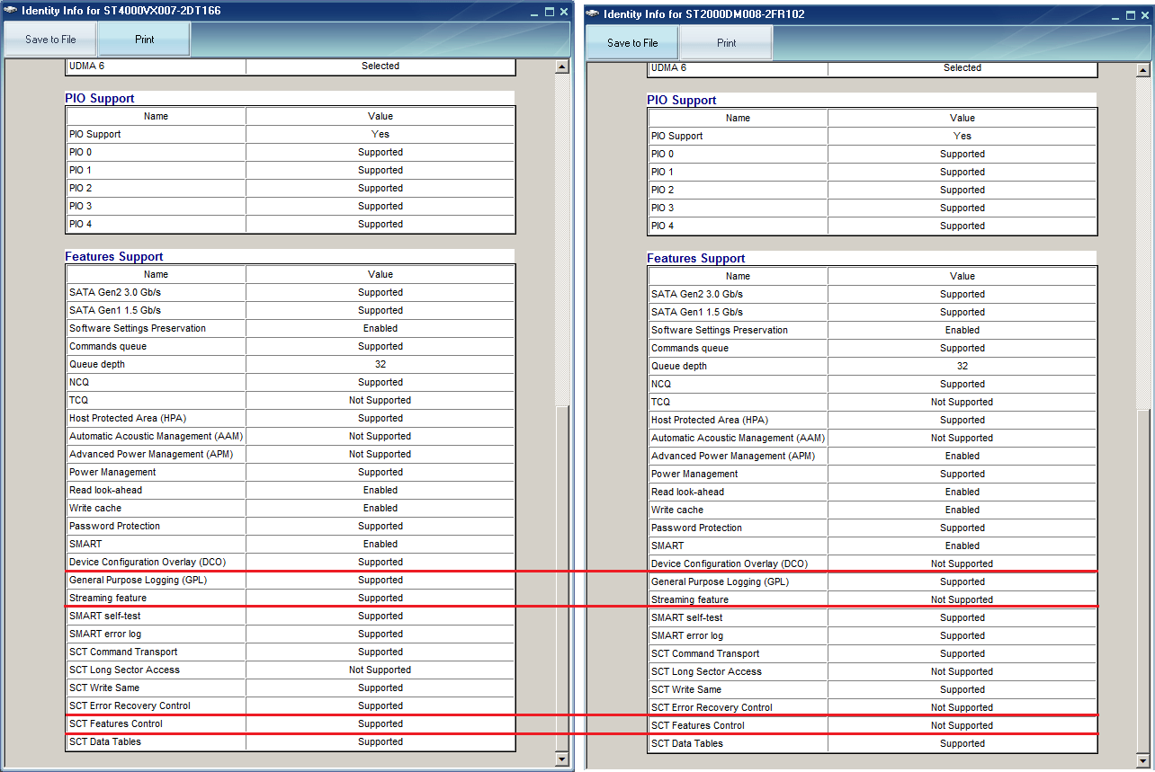 Что ж, оставим на время скоростные замеры накопителя и перейдем к его внутреннему устройству, а точнее – к возможностям прошивки. С помощью программы HDDScan у рассматриваемых жестких дисков сходу обнаружилось несколько отличий, а именно поддержка SkyHawk таких функций, как Streaming features, Device Configuration Overlay (DCO), SCT Error Recovery Control, SCT Features Control.
