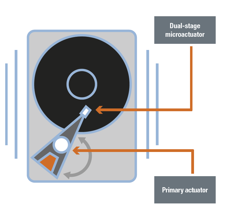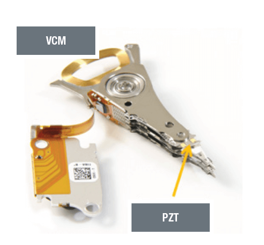 Например, используется два актуатора (по-русски, позиционера – устройства, перемещающего головки). Основной, VCM актуатор, имеет большой ход, но меньшую точность и отвечает за быстрое перемещение головок, второй, PZT микроактуатор, высокоточный, корректирует положение головок в малом диапазоне.