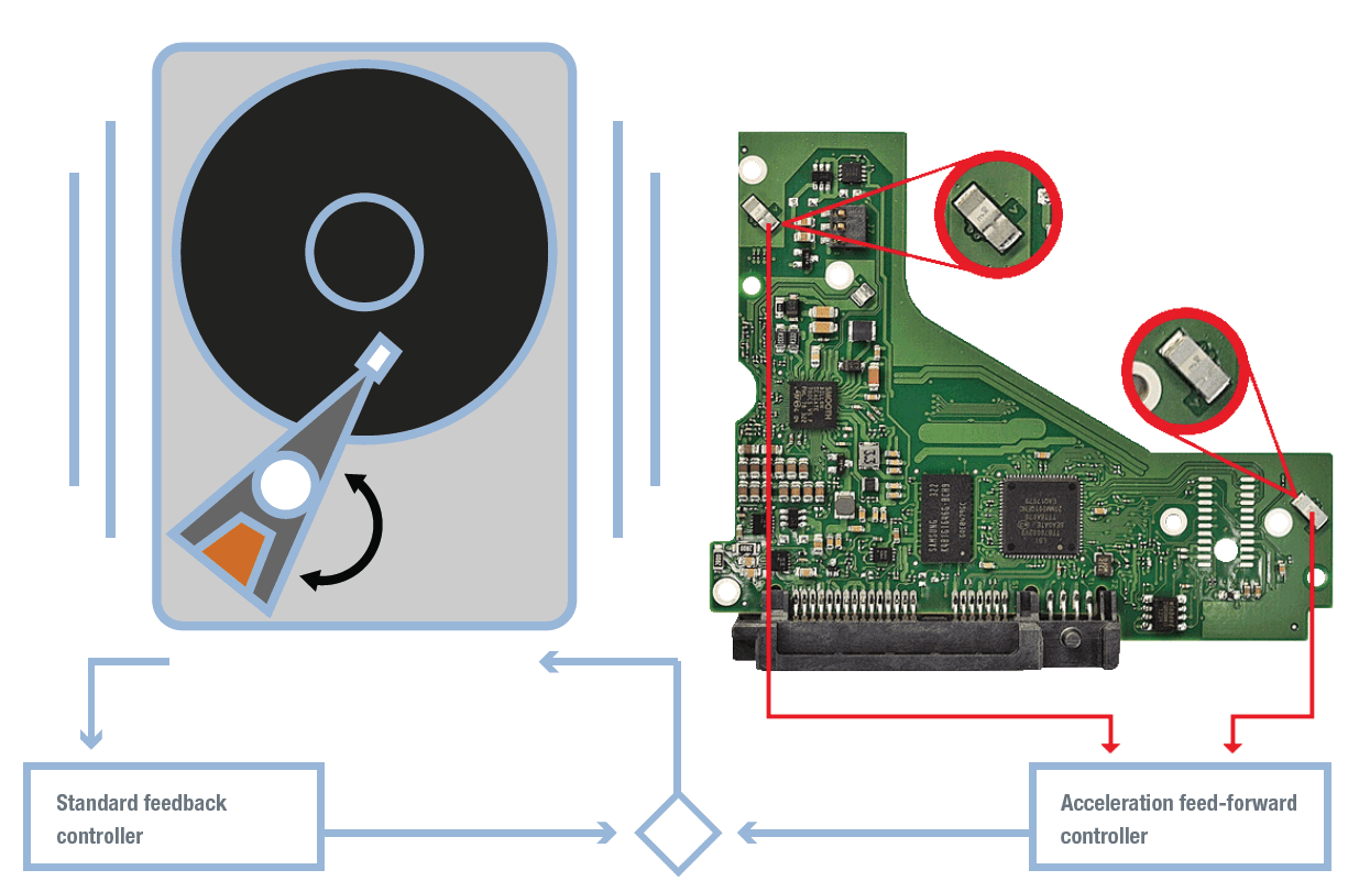 Кроме того, в составе управляющей платы имеются специальные датчики, отслеживающие возможную вибрацию при вращении блока магнитных головок на оси и посылающие соответствующие сигналы на актуаторы для ее (вибрации) подавления.