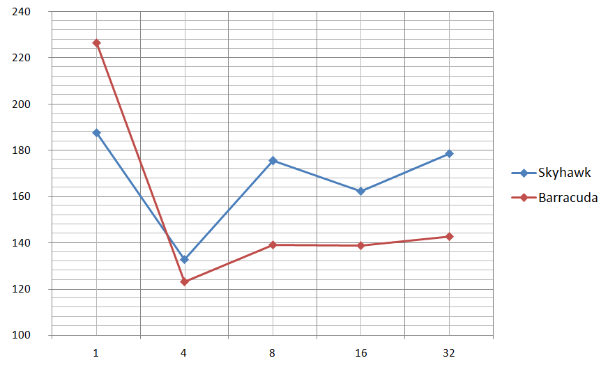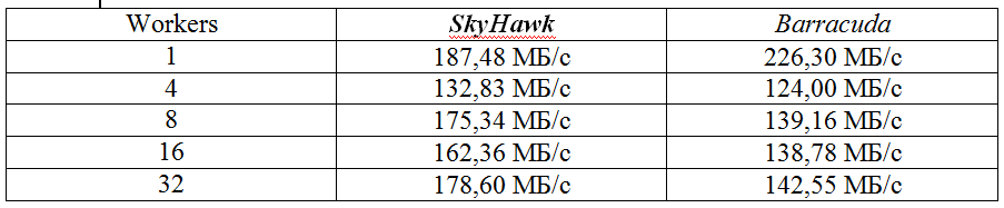 На графике наглядно видно, что лидировавший по скорости на протяжении всего тестирования жесткий диск Barracuda уже на четырех потоках сдал свои позиции и уступил пальму первенства накопителю Seagate SkyHawk. Что ж, все закономерно, каждый должен заниматься своим делом: один накопитель писать и читать потоковые данные в системе видеонаблюдения, другой – радовать пользователя ПК быстрой и стабильной работой внутри системного блока.