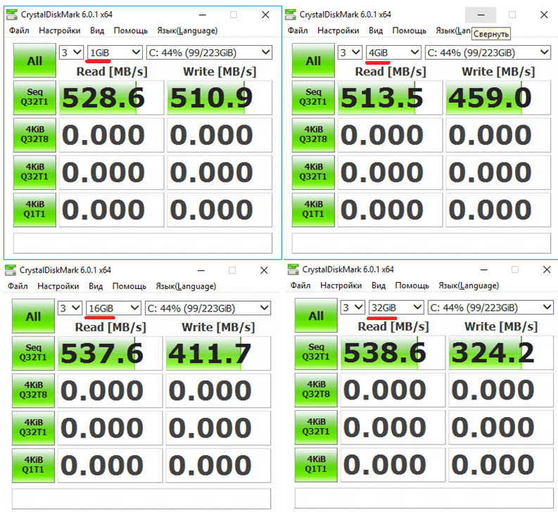 Последовательно увеличиваем тестовый файл (от 1 ГБ до 32 ГБ) и снова запускаем один из тестов. Видим, что для HDD скорость записи неизменна, в то время как для SSD значения падают.