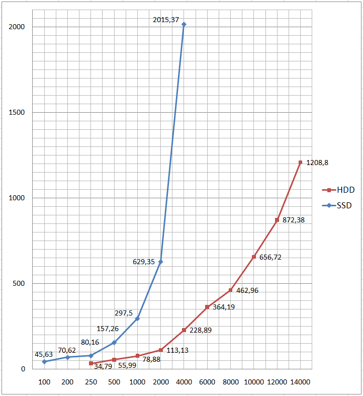 Идем далее. В свое время спрос на SSD родился благодаря их быстродействию, и, в большинстве случаев, пользователь действительно получает прирост по скорости обмена данными в несколько раз. Тем не менее, существуют ситуации, когда «типовой» жесткий диск окажется шустрее. Рассмотрим пример.