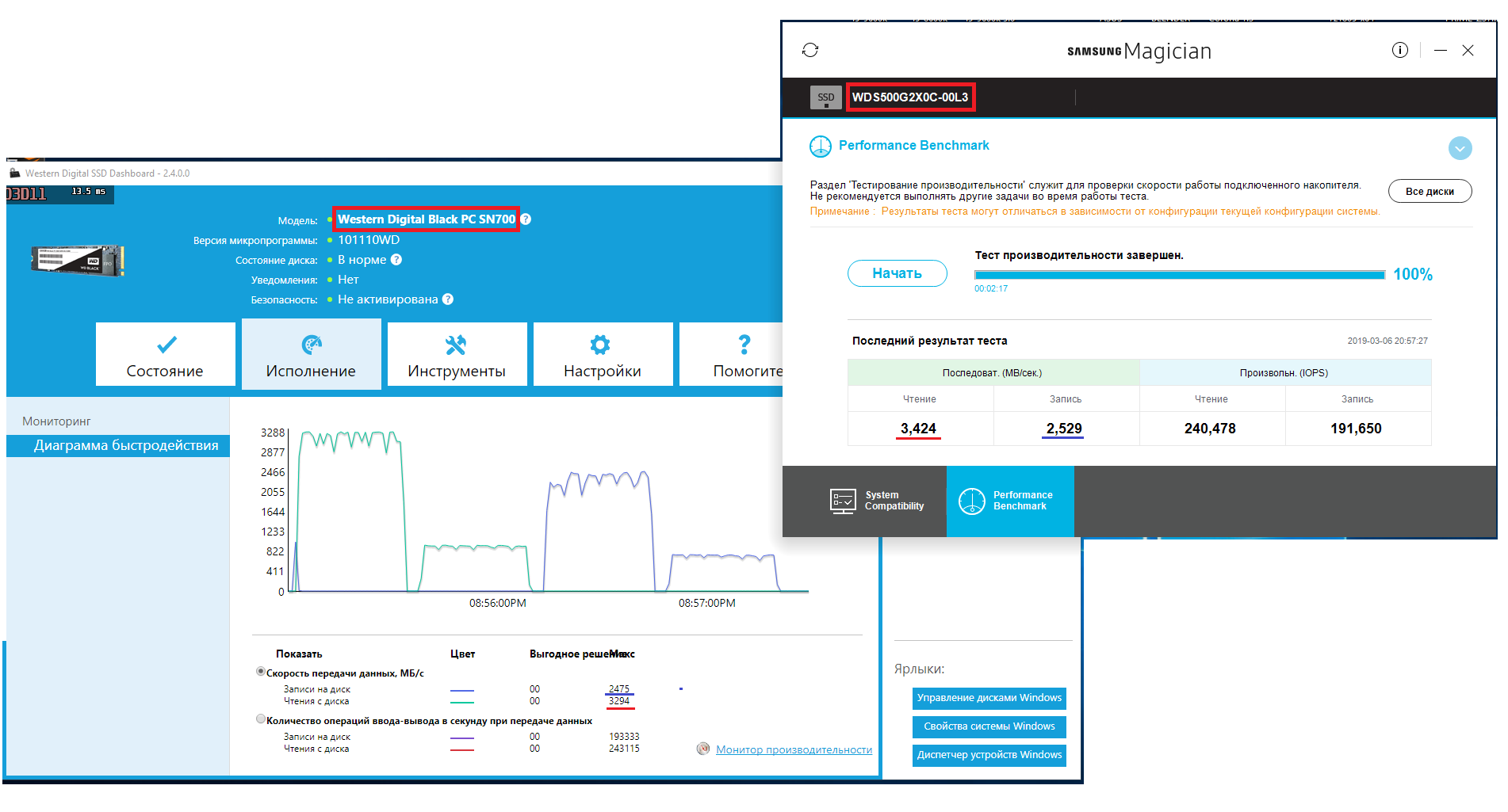 Далее запускались фирменные утилиты каждого из накопителей: Samsung Magician и Western Digital SSD Dashboard.
