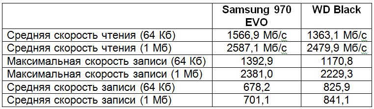 Запуск фирменных утилит, равно как и CrystalDiskMark, показал, что производители заявили реально достижимые скоростные показатели, в связи с чем, тестирование производительности далее было направлено на сравнение параметров WD Black и Samsung 970 EVO между собой.